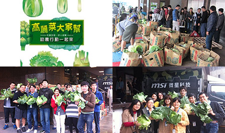 MSI and Hand-in-Hand Teen’s Service Center organized the MSI Chinese Cabbage Day to help famers in Yuenlin County to sell excessive Chinese cabbage. MSI purchased 3,000kg of Chinese cabbage from farmers, and each MSI employees could collect one for free. More than 2,000 MSI employees and family benefited from this event. By directly purchasing Chinese cabbage from farmers, MSI Taipei has helped farmers to overcome difficulty. MSI Taipei also provided employees with the contact information of farmers for employees to recommend them to other friends after tasting their great vegetable. By publicizing the buying channel of farmers in Yuenlin, more people can buy vegetable from them, and they can have a better life
