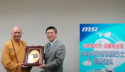 On June 7, 2010, a “Friendly Pick-up Service and Warmth from MSI” donation ceremony was held in the conference room of Taipei County Government, during which Rev. Zongdao of the Buddhist Compassion Relief Huai-Ren Foundation joyfully presented a plaque of appreciation to MSI Assistant VP Chien Wen-Che, thanking MSI for the donation of a handicap van to the Foundation. The donation solves the Foundation’s problem of lacking proper transportation to take its handicapped residents to school and doctors. The donation ceremony was a grand event attended by MSI representatives, recipients representing the Foundation, officers of Taipei County Bureau of Social Affairs, and a few handicapped people from the Foundation-affiliated Zhong Dao Jing Banqiao Center.| MSI Assistant VP Wayne Chien received a plaque of appreciation from Rev. Zongdao of the Buddhist Compassion Relief Huai-Ren Foundation |