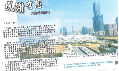 A massive gas explosion killed and injured a lot of people, damaged thousand houses, and ripped up main roads devastatingly in Qianzhen and Lingya Dist. in the southern Taiwanese city of Kaohsiung in 2014. The accident tremendously affected local residents, traffic and economic activities. Therefore, MSI donated 5 million NT dollars to the special Social Assistance Account opened by the Social Affairs Bureau of Kaohsiung City Government at the very first time to help the victims settle down and rebuild. Our employees also created a donate activity voluntarily, expecting to facilitate reconstruction.